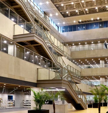 A Potsdamer Platz office concept focusing on sustainability, featuring natural materials, streamlined forms, and daylight streaming through floor-to-ceiling windows.